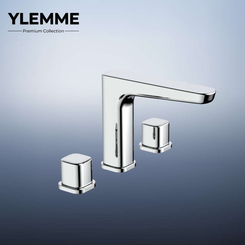 This refined three-hole basin faucet from YLEMME’s Premium Collection is meticulously crafted from solid brass, embodying enduring quality and fluid modern design. Its sleek curved central spout and two compact square control knobs create a balanced, minimalist silhouette, while the mirror-like chrome plating delivers a brilliant, tarnish-resistant finish that elevates any bathroom aesthetic. The dual knobs enable precise, independent control of water flow and temperature, blending seamless operation with understated elegance. Engineered for long-term reliability and corrosion resistance, it serves as a refined centerpiece for contemporary bathrooms, merging premium brass craftsmanship with innovative, streamlined design.