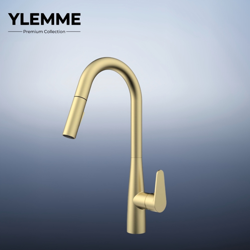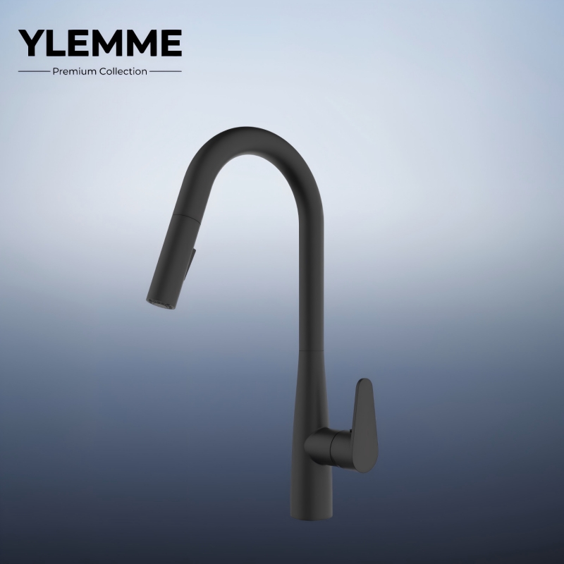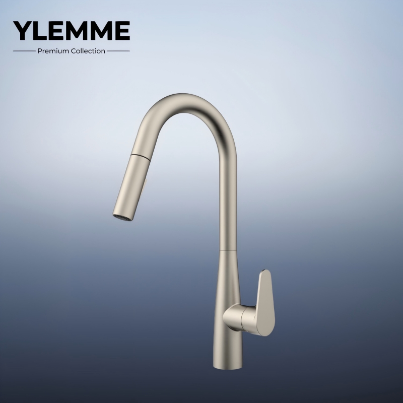 This sleek pull-down kitchen faucet from YLEMME’s Premium Collection is meticulously crafted from solid brass, blending enduring durability with minimalist modern functionality. Its graceful high-arc spout extends to a retractable pull-down spray head, offering versatile water flow options to streamline kitchen tasks. The polished chrome finish delivers a brilliant, tarnish-resistant shine that elevates any kitchen aesthetic, while the ergonomic single lever handle enables intuitive control over water flow and temperature. Engineered for long-term reliability and corrosion resistance, it serves as a refined centerpiece for contemporary kitchens, merging premium brass craftsmanship with innovative, practical design.