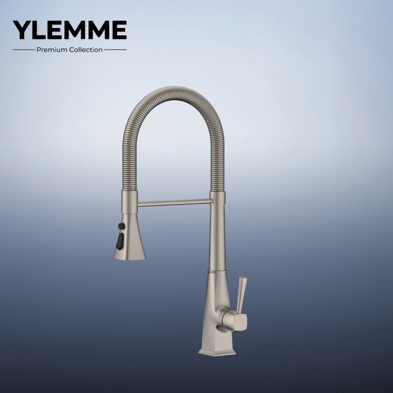 This industrial-inspired spring kitchen faucet from YLEMME’s Premium Collection is meticulously forged from solid brass, embodying uncompromising durability and bold contemporary design. Its flexible coiled spring spout and retractable pull-down spray head offer unrestricted movement, ideal for heavy-duty kitchen tasks. The matte black finish exudes rugged sophistication, resisting fingerprints and tarnish for a long-lasting, premium look. The ergonomic single lever handle enables intuitive control over water flow and temperature, while the high-arc design maximizes sink clearance. Engineered for long-term reliability, it merges robust brass craftsmanship with industrial functionality, serving as a striking centerpiece for modern culinary spaces.