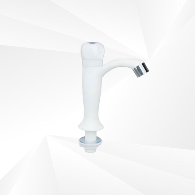 This elegant single-hole basin faucet features a graceful curved spout and ornate cross handle, crafted from durable plastic to ensure long-lasting performance for daily use. Its chrome-plated spout tip and handle base deliver a polished, scratch-resistant finish that resists tarnish, while the matte white main body adds a clean, timeless touch to any bathroom decor. Designed for single cold water supply, it offers smooth, precise flow control with an easy-to-grip cross handle. Simple to install on standard single-hole mounts, it blends classic design, reliable functionality, and exceptional value, making it an ideal choice for residential and commercial bathroom spaces.